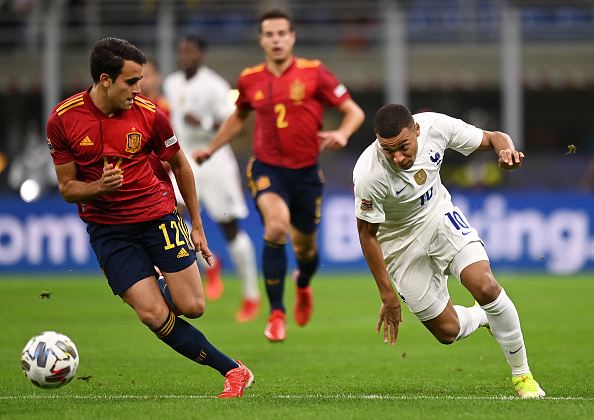 MILAN, ITALY – OCTOBER 10: Eric Garcia of Spain battles for possession with Kylian Mbappe of France during the UEFA Nations League 2021 Final match between Spain and France at San Siro Stadium on October 10, 2021 in Milan, Italy. (Photo by Tullio Puglia – UEFA/UEFA via Getty Images)